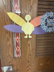 Faculty received an envelope of five turkey feathers with the names of different teachers and faculty members around the school. It was their job to come up with something they were grateful for or liked about each of the five faculty members. For example, they could say, “I’m grateful that you always show up with a positive attitude and a readiness to get stuff done” or “I’m grateful that you care so much about your peers and students.” After they had written their messages on the feathers, they would put them in the envelope and return them to Mrs. Cip. After this, Mrs. Cip would task her students to collect the turkey feathers and stick them on the cut-out turkey of the corresponding teacher.